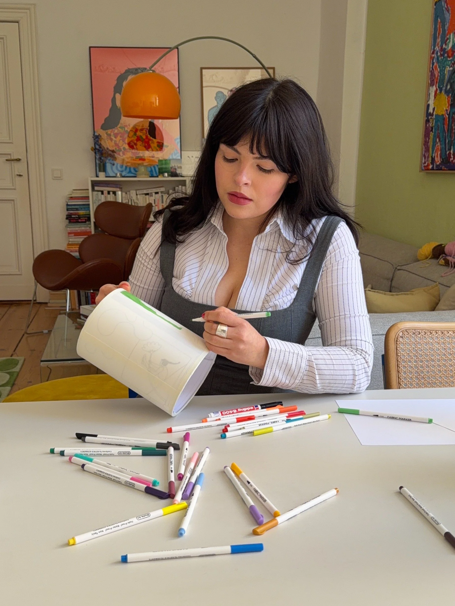 This unique piece features a narrative woven around a central bloom, where vibrant colors meet fluid, organic shapes. Using textile markers as her medium, the artist creates a sense of weightless movement—as if the story itself is floating around the light.