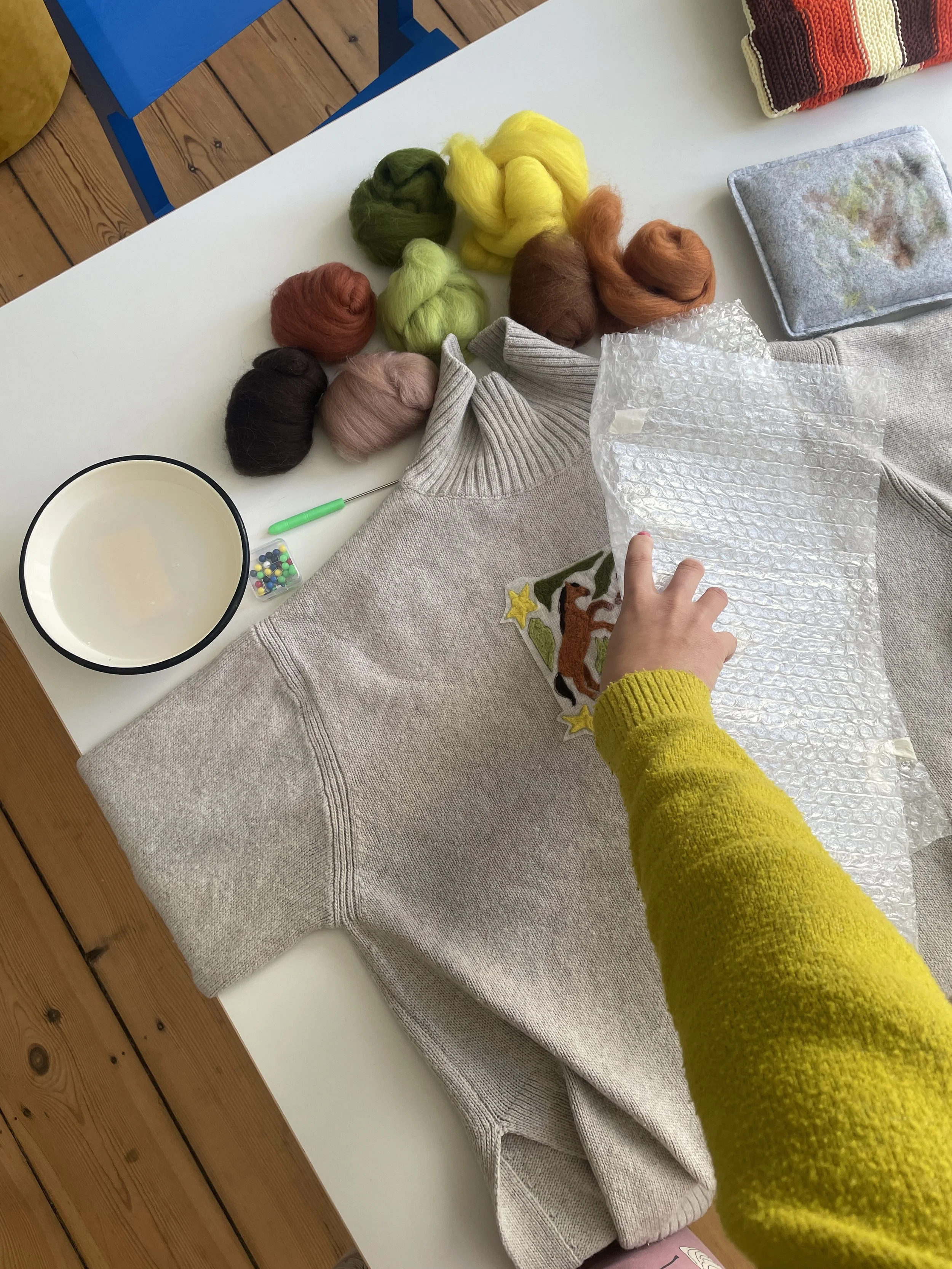 These objects—ranging from painted textiles to intricate needle-felted designs—are created as individual editions. No two pieces are the same, bringing my bold color planes from the canvas onto the fabric and other surfaces.